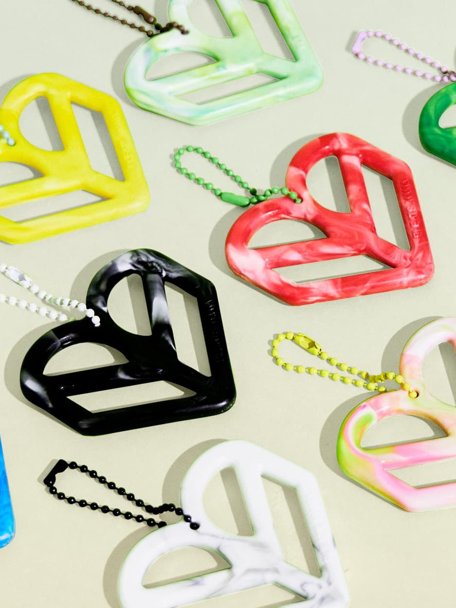 The keyring, made by recycling about 5 bottle caps, features a heart shape that embodies the sincerity of PLEATSMAMA and vibrant colors.