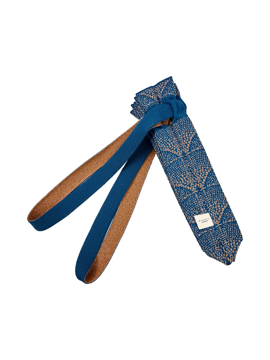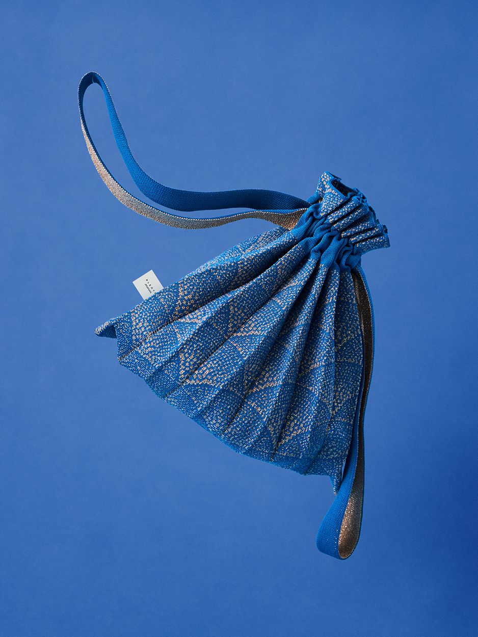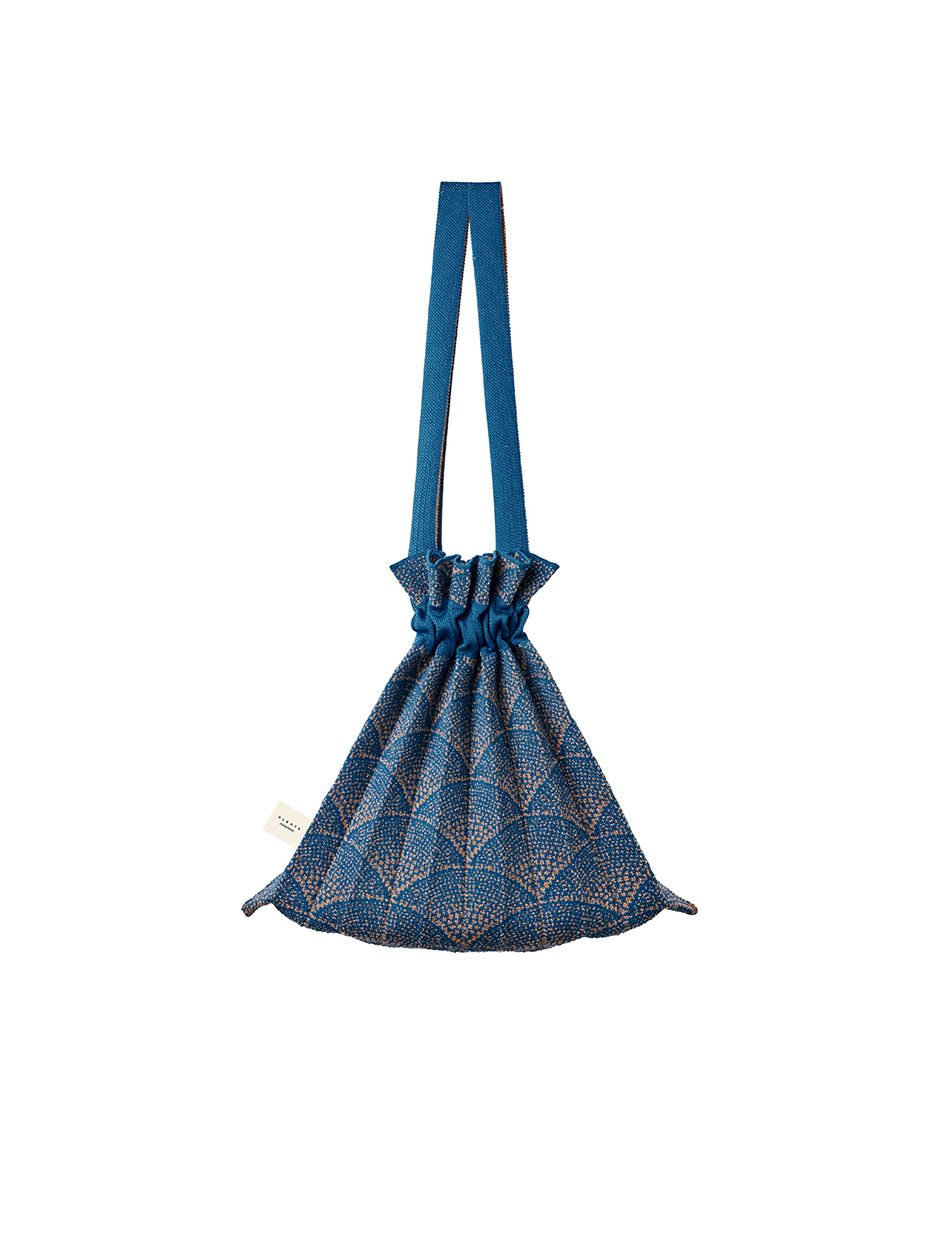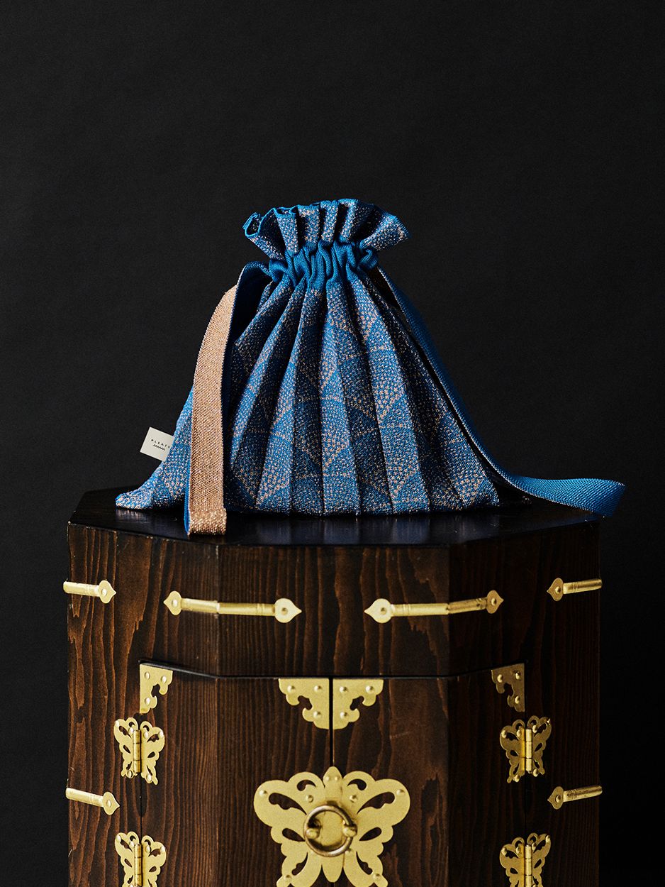 A mini bubble bag reminiscent of a lucky pouch with an oriental pattern of the rising sun and blue dragon, gives it a luxurious touch.